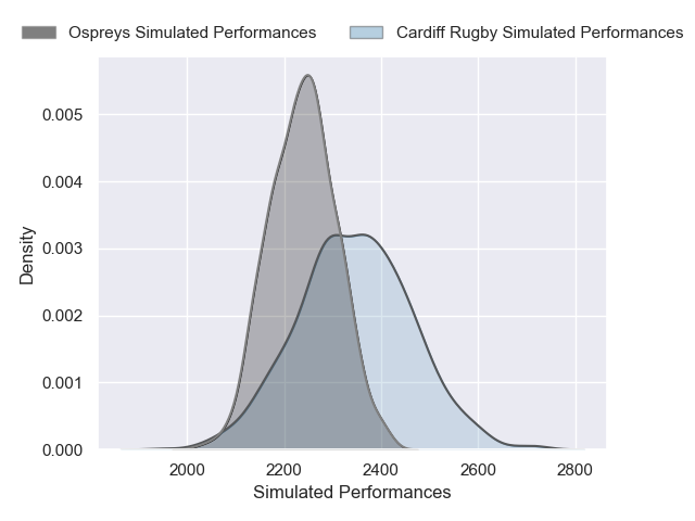 Each club has a rating and a rating deviation (similar to a Glicko rating), and expected performances can be generated. This allows for simulated matches and spreads like the ones below.