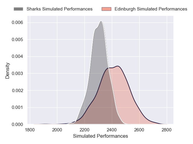 Each club has a rating and a rating deviation (similar to a Glicko rating), and expected performances can be generated. This allows for simulated matches and spreads like the ones below.