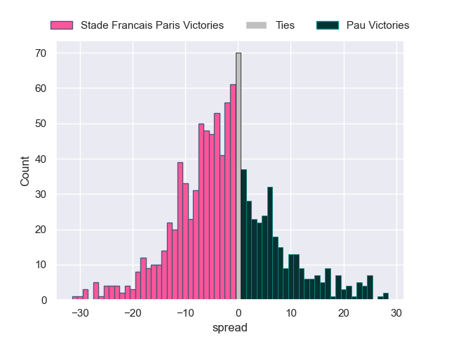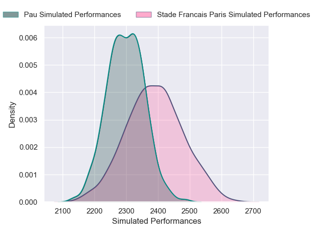 Each club has a rating and a rating deviation (similar to a Glicko rating), and expected performances can be generated. This allows for simulated matches and spreads like the ones below.