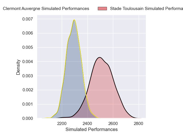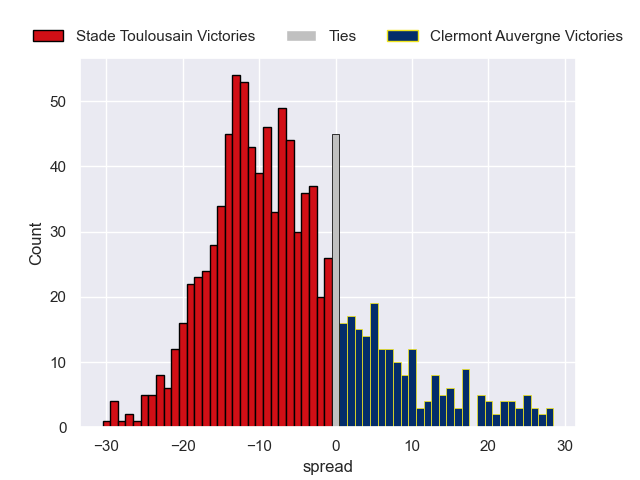 Each club has a rating and a rating deviation (similar to a Glicko rating), and expected performances can be generated. This allows for simulated matches and spreads like the ones below.