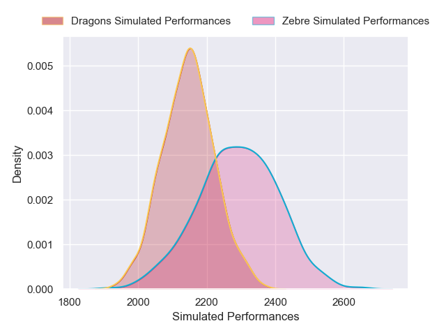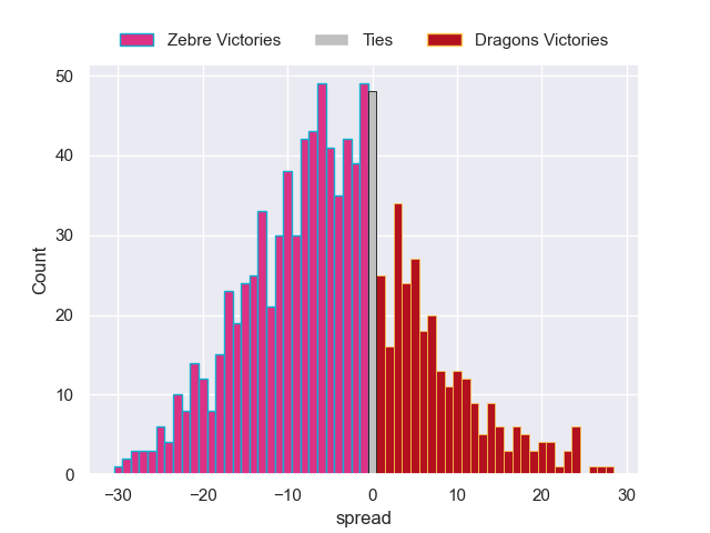 Each club has a rating and a rating deviation (similar to a Glicko rating), and expected performances can be generated. This allows for simulated matches and spreads like the ones below.