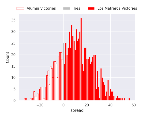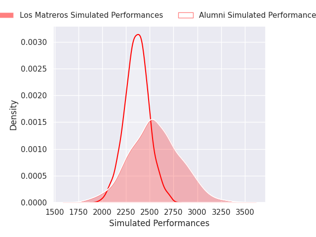 Each club has a rating and a rating deviation (similar to a Glicko rating), and expected performances can be generated. This allows for simulated matches and spreads like the ones below.