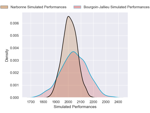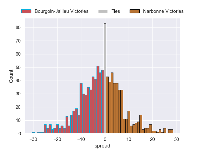 Each club has a rating and a rating deviation (similar to a Glicko rating), and expected performances can be generated. This allows for simulated matches and spreads like the ones below.