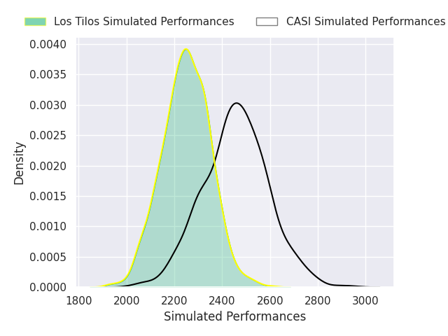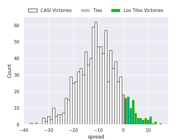 Each club has a rating and a rating deviation (similar to a Glicko rating), and expected performances can be generated. This allows for simulated matches and spreads like the ones below.