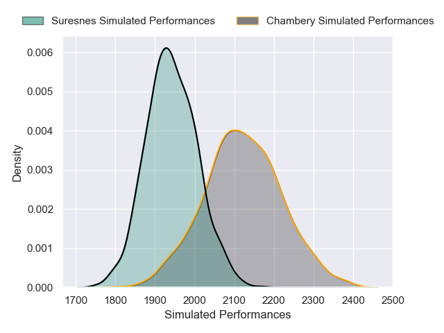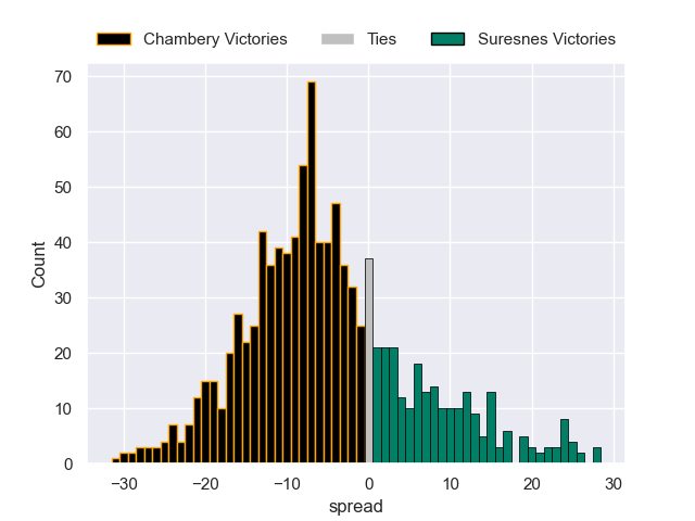 Each club has a rating and a rating deviation (similar to a Glicko rating), and expected performances can be generated. This allows for simulated matches and spreads like the ones below.