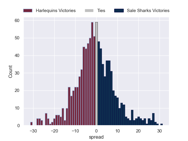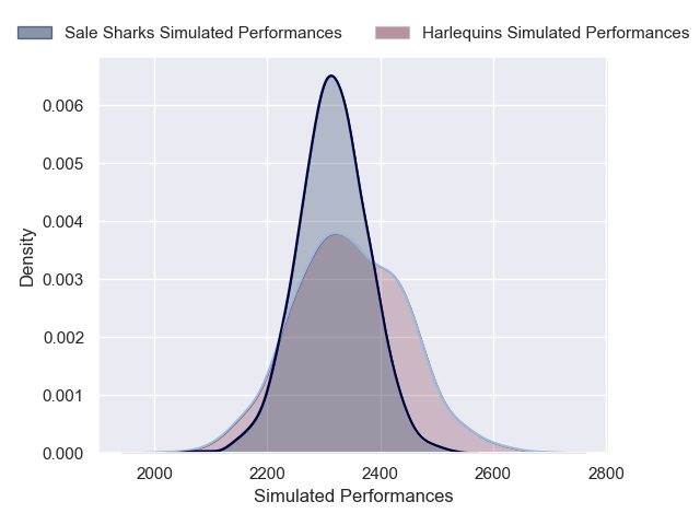 Each club has a rating and a rating deviation (similar to a Glicko rating), and expected performances can be generated. This allows for simulated matches and spreads like the ones below.