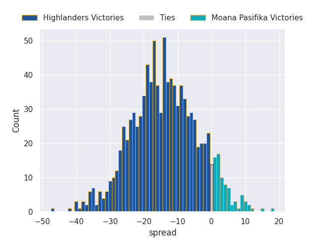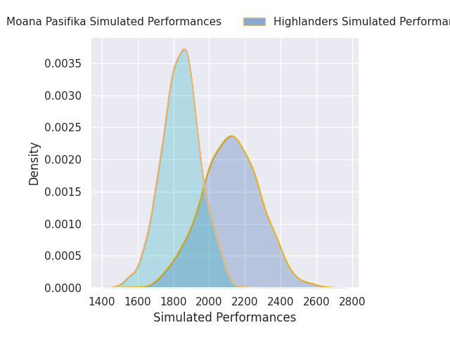Each club has a rating and a rating deviation (similar to a Glicko rating), and expected performances can be generated. This allows for simulated matches and spreads like the ones below.