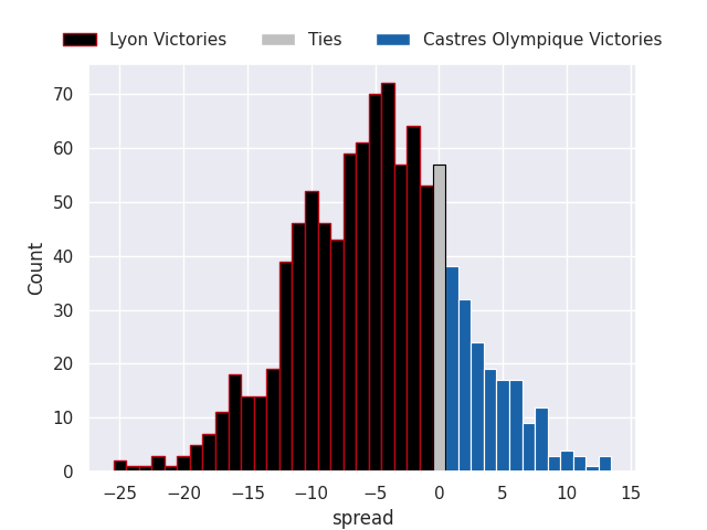 Each club has a rating and a rating deviation (similar to a Glicko rating), and expected performances can be generated. This allows for simulated matches and spreads like the ones below.