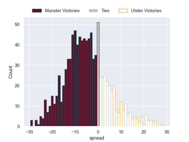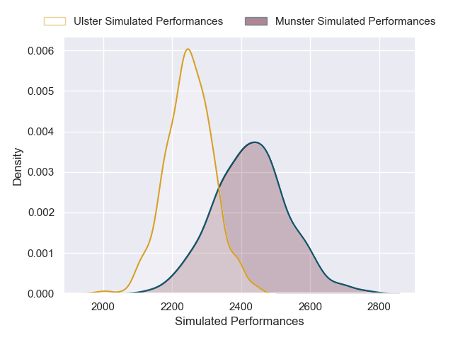 Each club has a rating and a rating deviation (similar to a Glicko rating), and expected performances can be generated. This allows for simulated matches and spreads like the ones below.