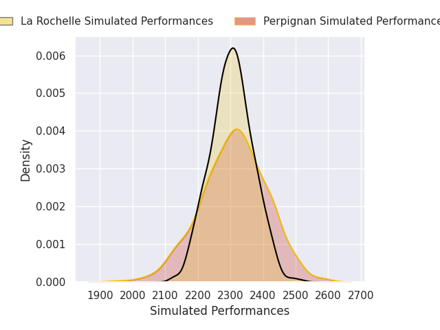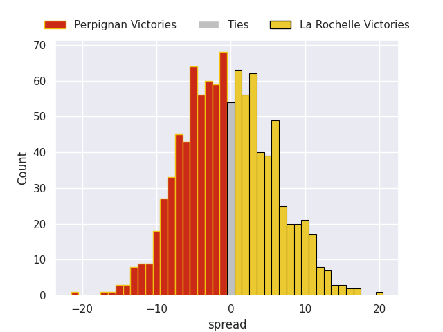 Each club has a rating and a rating deviation (similar to a Glicko rating), and expected performances can be generated. This allows for simulated matches and spreads like the ones below.