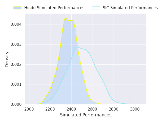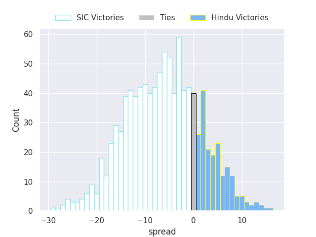 Each club has a rating and a rating deviation (similar to a Glicko rating), and expected performances can be generated. This allows for simulated matches and spreads like the ones below.