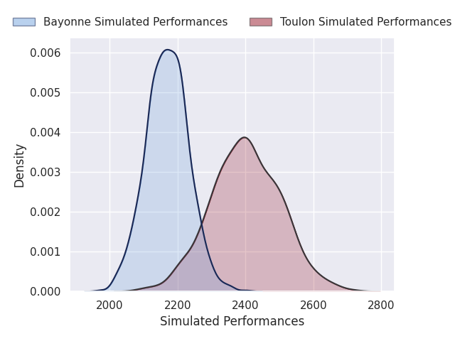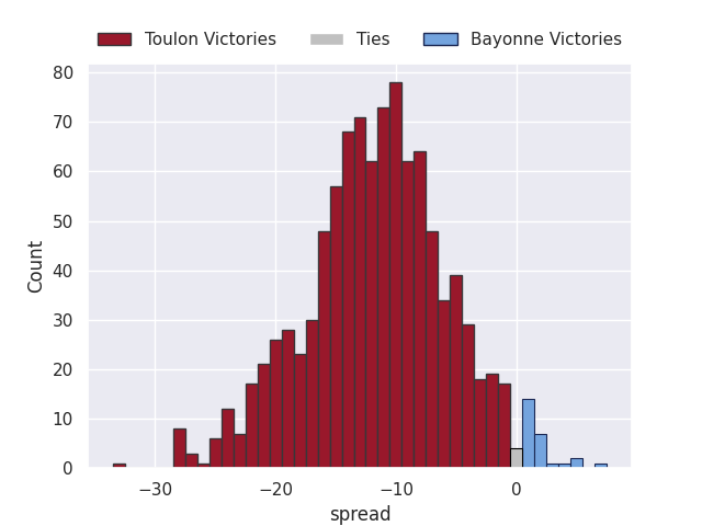Each club has a rating and a rating deviation (similar to a Glicko rating), and expected performances can be generated. This allows for simulated matches and spreads like the ones below.