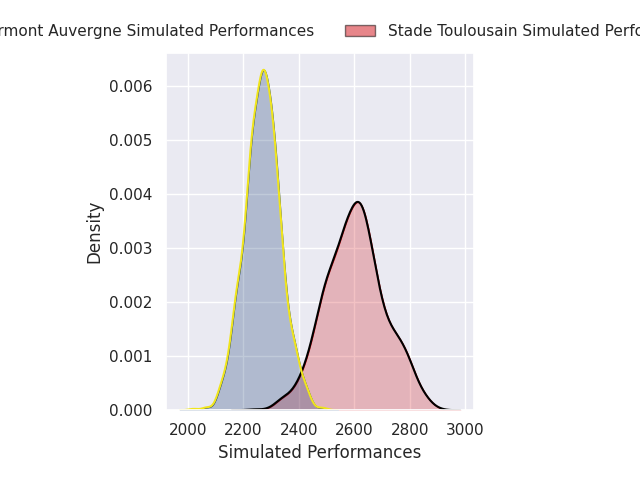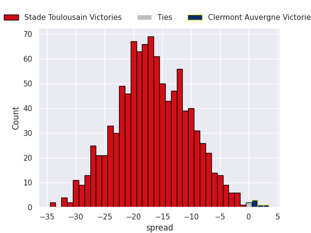 Each club has a rating and a rating deviation (similar to a Glicko rating), and expected performances can be generated. This allows for simulated matches and spreads like the ones below.
