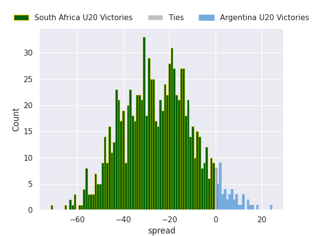 Each club has a rating and a rating deviation (similar to a Glicko rating), and expected performances can be generated. This allows for simulated matches and spreads like the ones below.