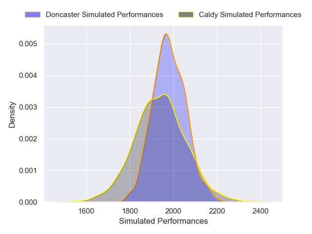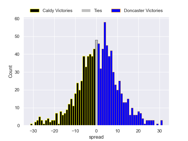 Each club has a rating and a rating deviation (similar to a Glicko rating), and expected performances can be generated. This allows for simulated matches and spreads like the ones below.
