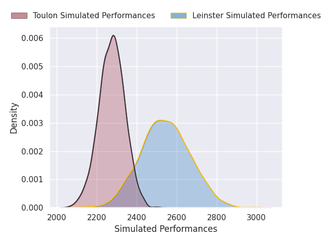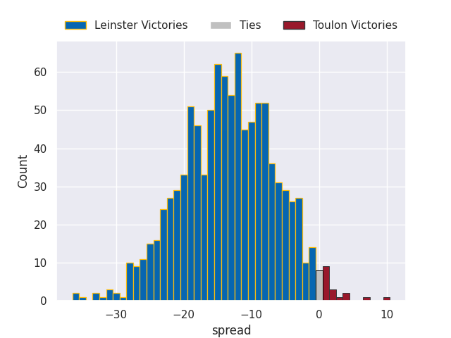 Each club has a rating and a rating deviation (similar to a Glicko rating), and expected performances can be generated. This allows for simulated matches and spreads like the ones below.