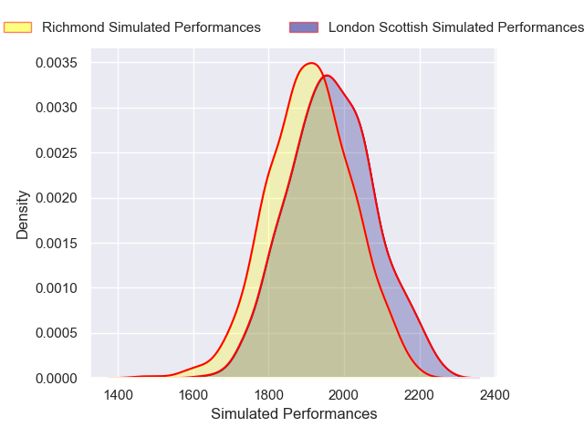 Each club has a rating and a rating deviation (similar to a Glicko rating), and expected performances can be generated. This allows for simulated matches and spreads like the ones below.