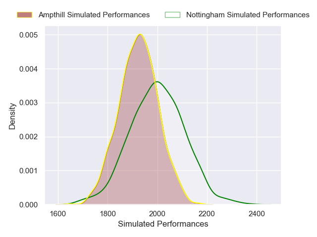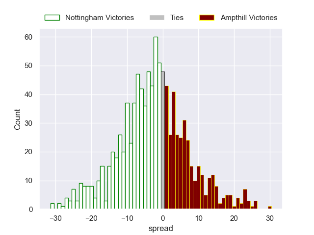 Each club has a rating and a rating deviation (similar to a Glicko rating), and expected performances can be generated. This allows for simulated matches and spreads like the ones below.