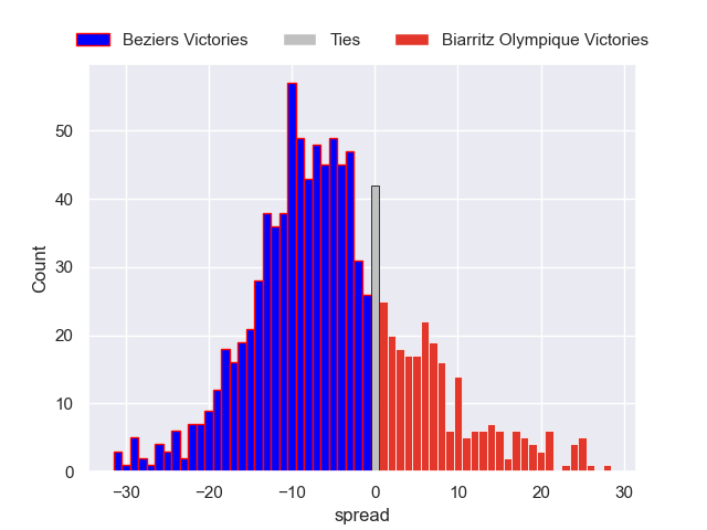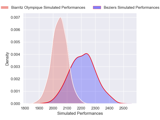 Each club has a rating and a rating deviation (similar to a Glicko rating), and expected performances can be generated. This allows for simulated matches and spreads like the ones below.