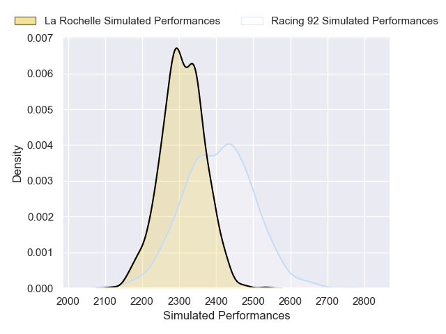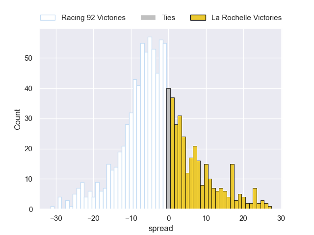 Each club has a rating and a rating deviation (similar to a Glicko rating), and expected performances can be generated. This allows for simulated matches and spreads like the ones below.