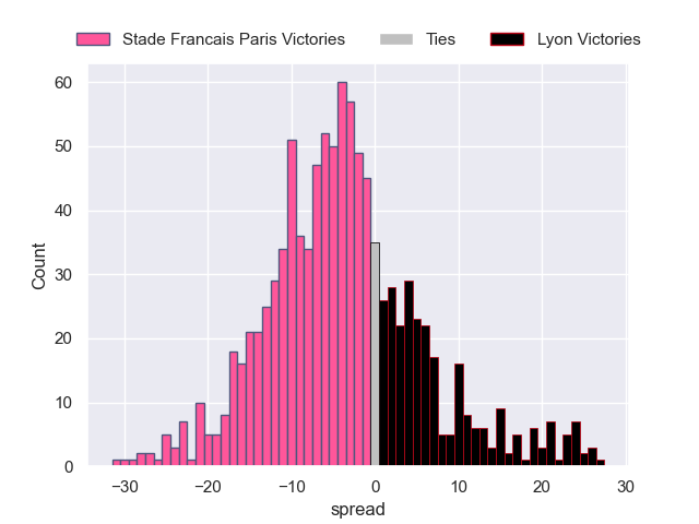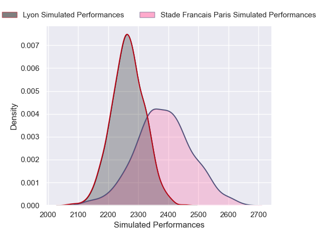 Each club has a rating and a rating deviation (similar to a Glicko rating), and expected performances can be generated. This allows for simulated matches and spreads like the ones below.