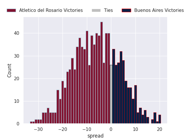 Each club has a rating and a rating deviation (similar to a Glicko rating), and expected performances can be generated. This allows for simulated matches and spreads like the ones below.
