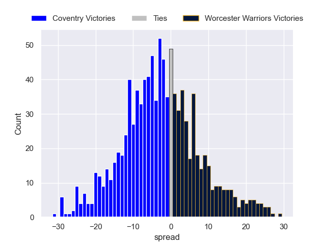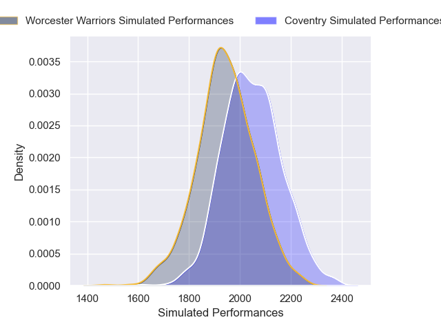 Each club has a rating and a rating deviation (similar to a Glicko rating), and expected performances can be generated. This allows for simulated matches and spreads like the ones below.