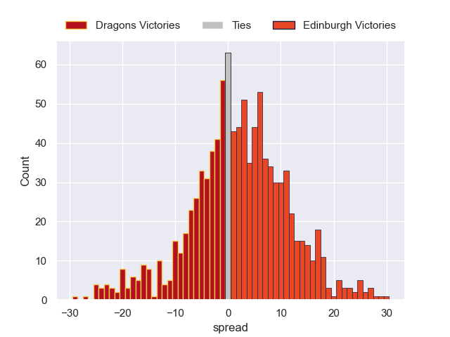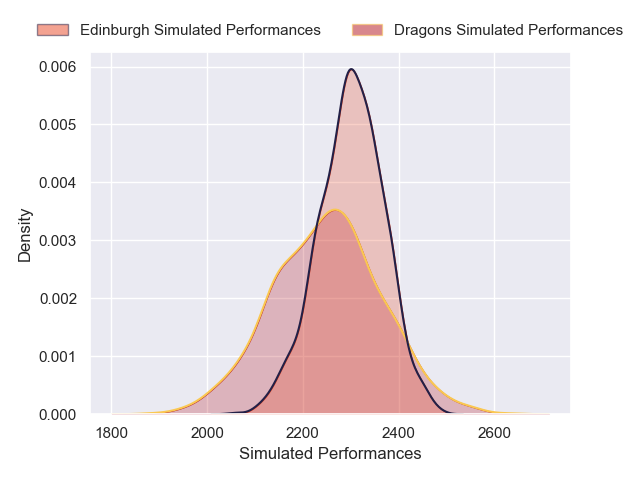 Each club has a rating and a rating deviation (similar to a Glicko rating), and expected performances can be generated. This allows for simulated matches and spreads like the ones below.