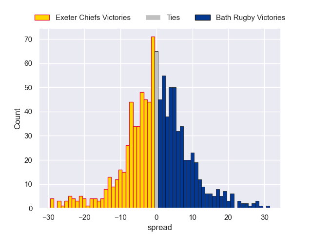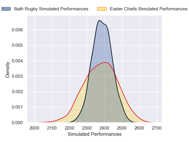 Each club has a rating and a rating deviation (similar to a Glicko rating), and expected performances can be generated. This allows for simulated matches and spreads like the ones below.