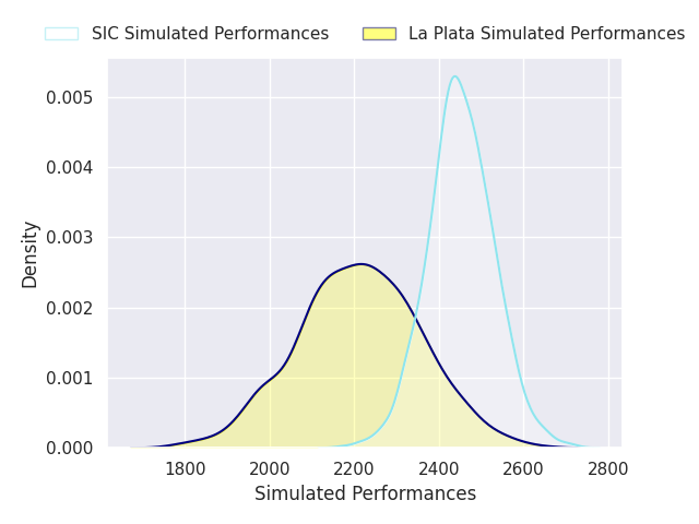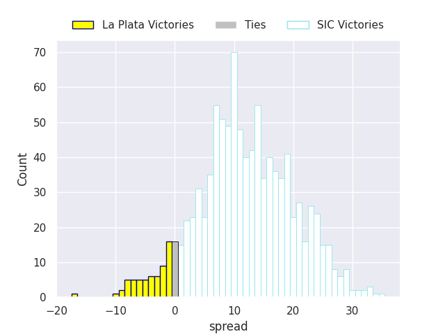 Each club has a rating and a rating deviation (similar to a Glicko rating), and expected performances can be generated. This allows for simulated matches and spreads like the ones below.