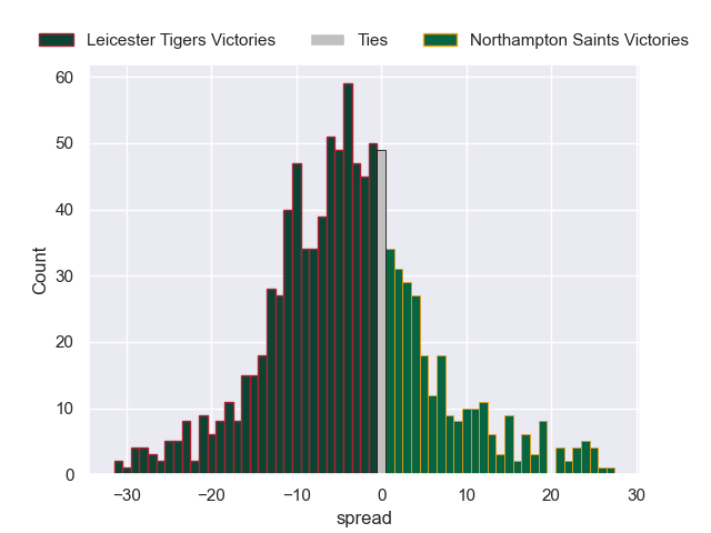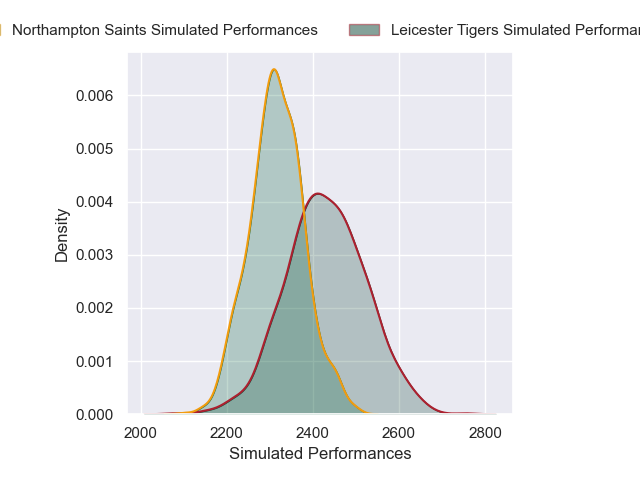 Each club has a rating and a rating deviation (similar to a Glicko rating), and expected performances can be generated. This allows for simulated matches and spreads like the ones below.
