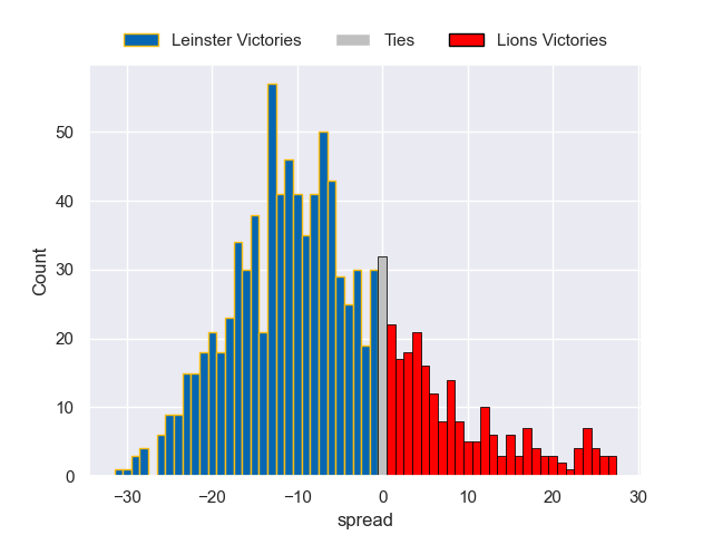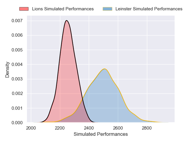 Each club has a rating and a rating deviation (similar to a Glicko rating), and expected performances can be generated. This allows for simulated matches and spreads like the ones below.