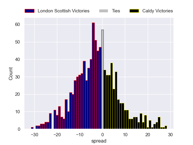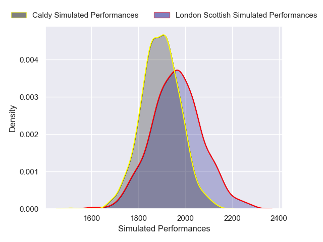 Each club has a rating and a rating deviation (similar to a Glicko rating), and expected performances can be generated. This allows for simulated matches and spreads like the ones below.