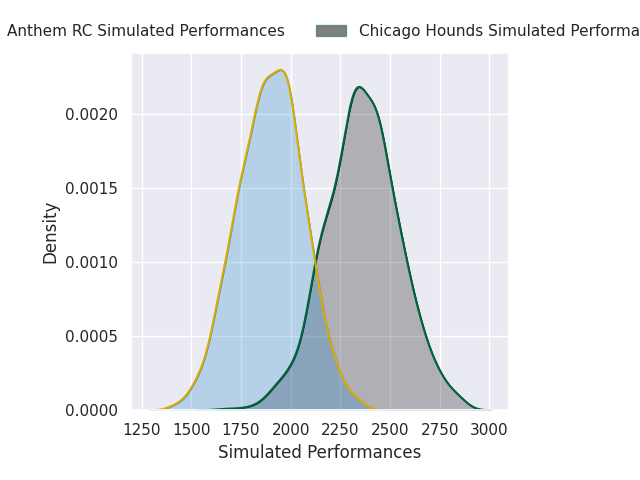Each club has a rating and a rating deviation (similar to a Glicko rating), and expected performances can be generated. This allows for simulated matches and spreads like the ones below.