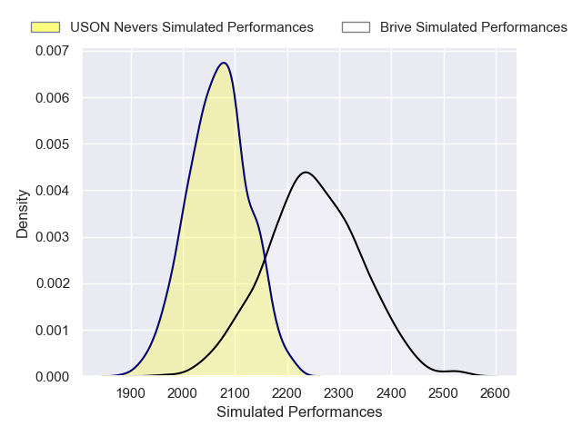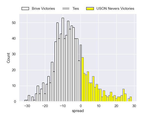Each club has a rating and a rating deviation (similar to a Glicko rating), and expected performances can be generated. This allows for simulated matches and spreads like the ones below.