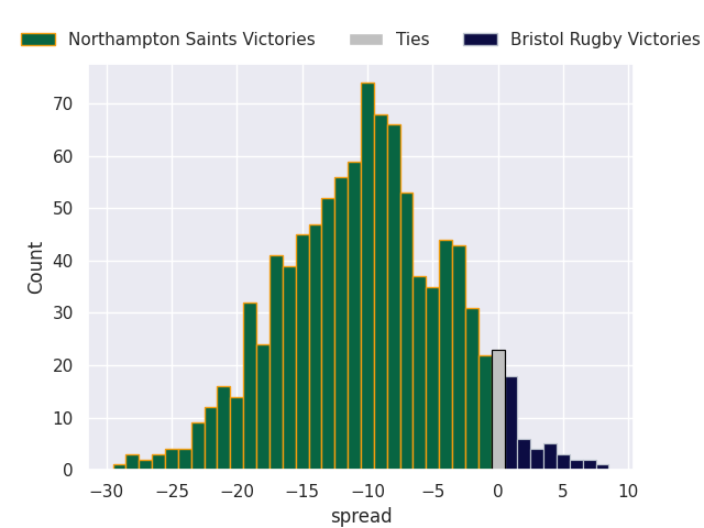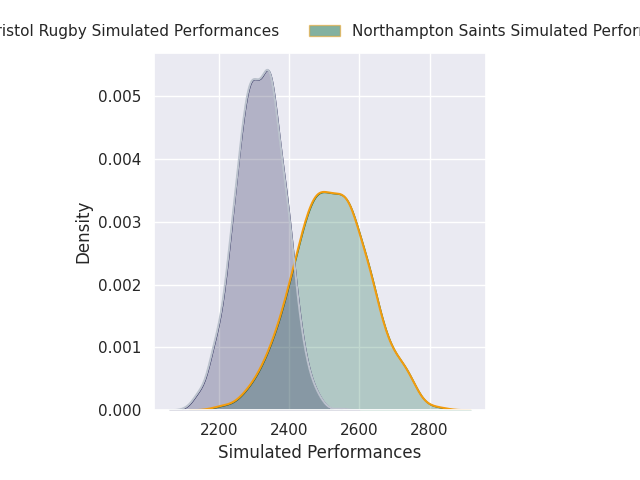 Each club has a rating and a rating deviation (similar to a Glicko rating), and expected performances can be generated. This allows for simulated matches and spreads like the ones below.