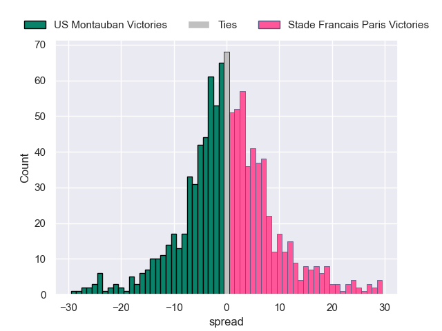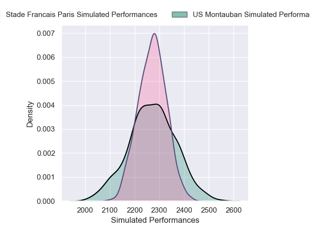 Each club has a rating and a rating deviation (similar to a Glicko rating), and expected performances can be generated. This allows for simulated matches and spreads like the ones below.
