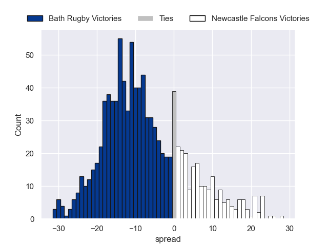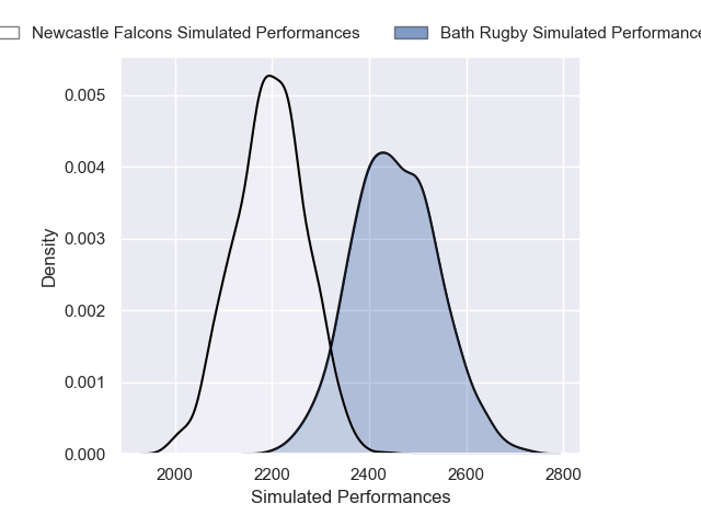 Each club has a rating and a rating deviation (similar to a Glicko rating), and expected performances can be generated. This allows for simulated matches and spreads like the ones below.