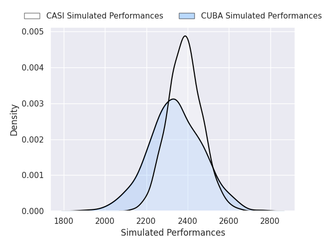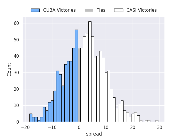 Each club has a rating and a rating deviation (similar to a Glicko rating), and expected performances can be generated. This allows for simulated matches and spreads like the ones below.
