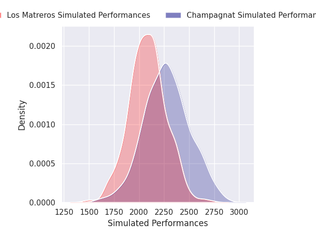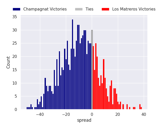 Each club has a rating and a rating deviation (similar to a Glicko rating), and expected performances can be generated. This allows for simulated matches and spreads like the ones below.