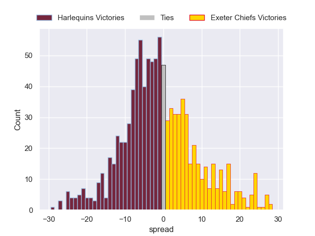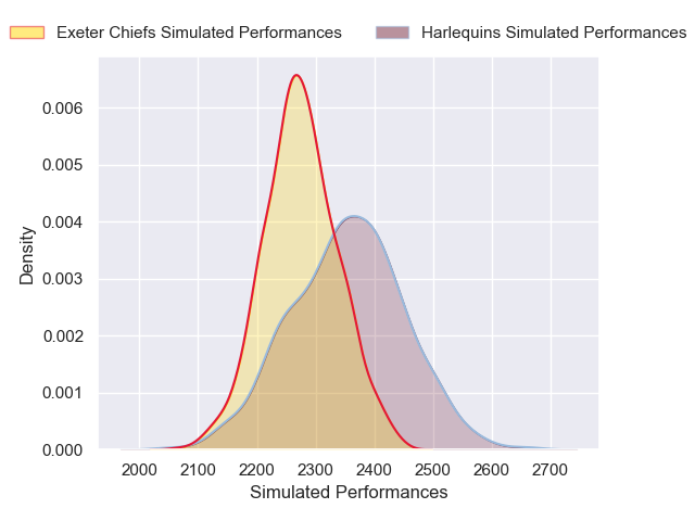 Each club has a rating and a rating deviation (similar to a Glicko rating), and expected performances can be generated. This allows for simulated matches and spreads like the ones below.