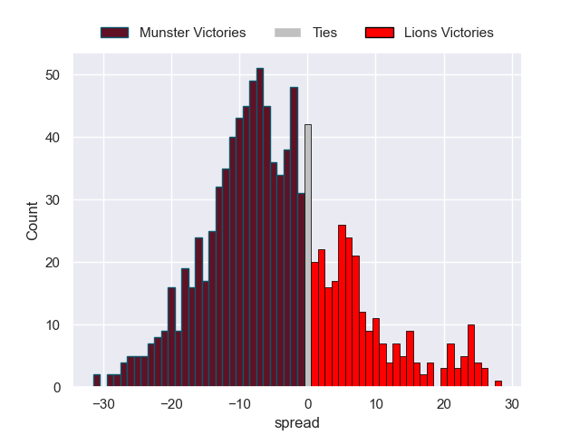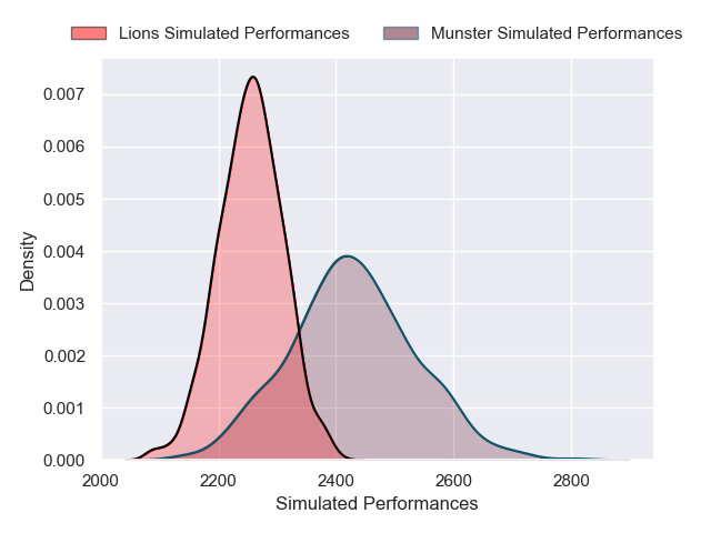Each club has a rating and a rating deviation (similar to a Glicko rating), and expected performances can be generated. This allows for simulated matches and spreads like the ones below.