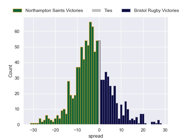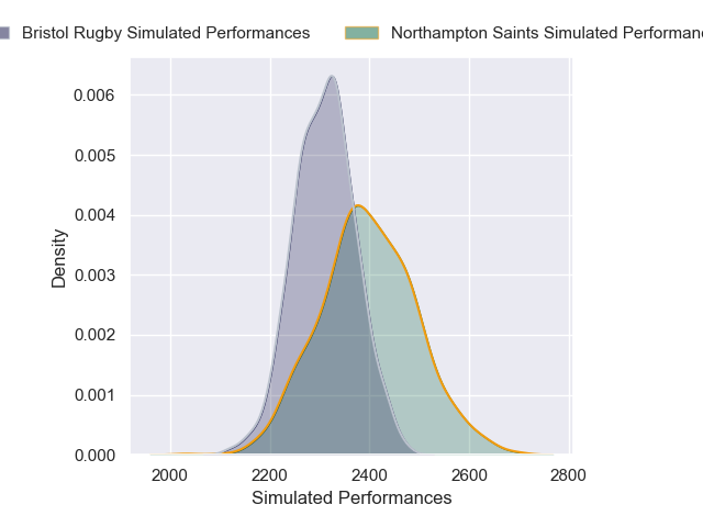 Each club has a rating and a rating deviation (similar to a Glicko rating), and expected performances can be generated. This allows for simulated matches and spreads like the ones below.
