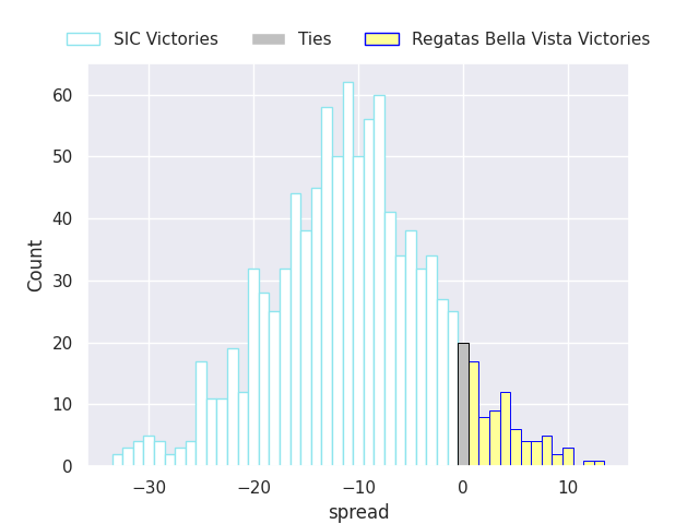 Each club has a rating and a rating deviation (similar to a Glicko rating), and expected performances can be generated. This allows for simulated matches and spreads like the ones below.