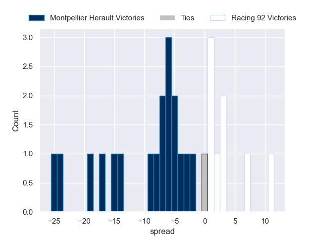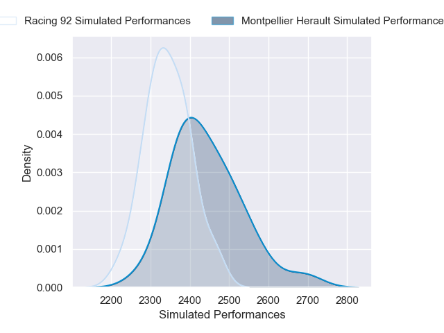 Each club has a rating and a rating deviation (similar to a Glicko rating), and expected performances can be generated. This allows for simulated matches and spreads like the ones below.