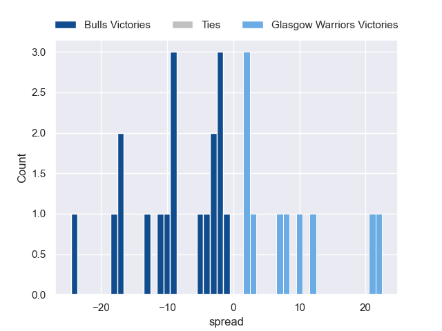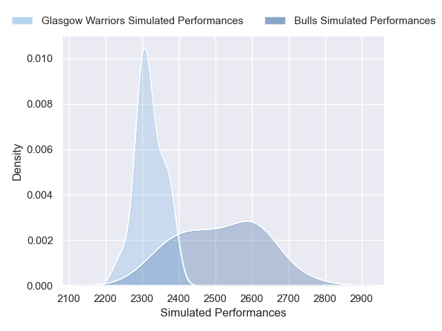 Each club has a rating and a rating deviation (similar to a Glicko rating), and expected performances can be generated. This allows for simulated matches and spreads like the ones below.