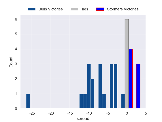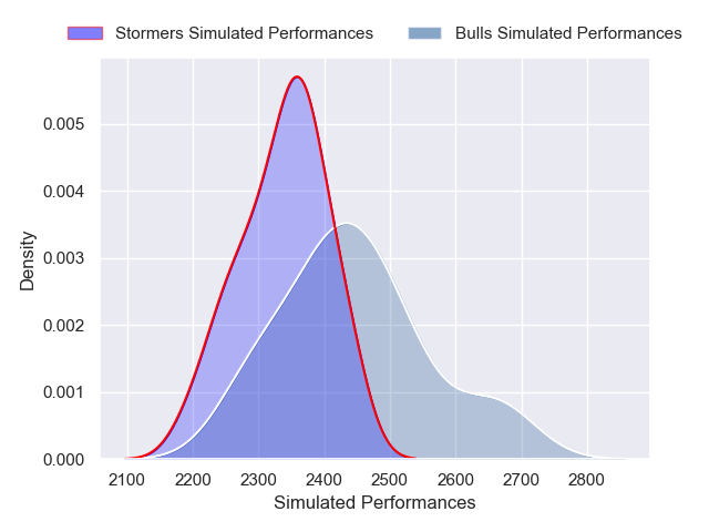 Each club has a rating and a rating deviation (similar to a Glicko rating), and expected performances can be generated. This allows for simulated matches and spreads like the ones below.