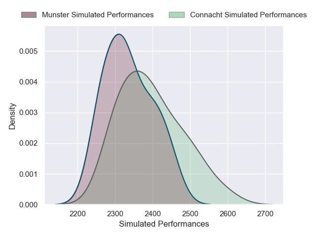 Each club has a rating and a rating deviation (similar to a Glicko rating), and expected performances can be generated. This allows for simulated matches and spreads like the ones below.