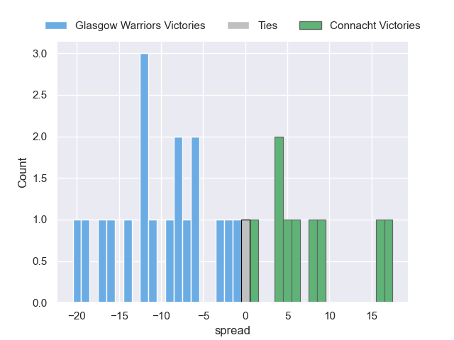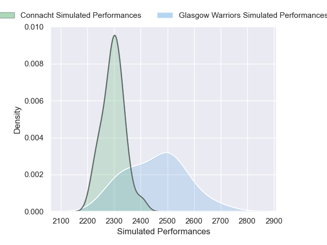 Each club has a rating and a rating deviation (similar to a Glicko rating), and expected performances can be generated. This allows for simulated matches and spreads like the ones below.