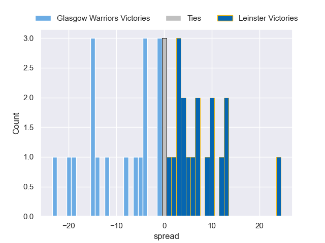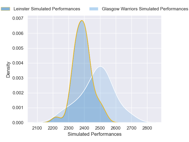 Each club has a rating and a rating deviation (similar to a Glicko rating), and expected performances can be generated. This allows for simulated matches and spreads like the ones below.